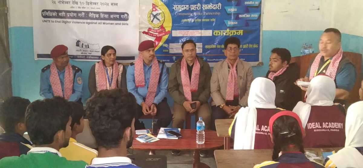 बिरगंज १६ मंसिर लैङ्गिक हिंसा विरुद्धको १६ दिने अभियानको अवसरमा सामुदायिक प्रहरी सेवा केन्द्र छपकैयाको आयोजनामा तथा आइडिएल बोर्डिङ स्कूलको सहकार्यमा लागुऔषध दुरुपयोग रोकथाम तथा जनचेतनामूलक कार्यक्रम आइडिएल बोर्डिङ स्कूलमा सम्पन्न गरिएको छ। कार्यक्रममा शिक्षक–शिक्षिका, विद्यार्थी, अभिभावक, स्थानीयवासी तथा सामुदायिक प्रहरी प्रतिनिधिहरूको व्यापक उपस्थिति रहेको थियो। सहभागीहरूलाई लागुऔषधको असर, जोखिम, कानुनी परिणाम, यसका सामाजिक प्रभाव र किशोर–किशोरीलाई लागुऔषधबाट जोगाउन परिवार तथा समुदायको भूमिकाबारे विस्तृत जानकारी दिइ्यो। कार्यक्रम सामुदायिक प्रहरी सेवा केन्द्र छपकैयाका अध्यक्ष ग्यासुदिन ठकुराईको अध्यक्षतामा सम्पन्न भएको थियो।विशेष उपस्थितिमा वडा अध्यक्ष: रियाज मिया तेलि,वडा सदस्य: बसिर मिया,स्कूल निर्देशक: शौकत अली,प्रिन्सिपल: विकास राई लगाएतकाहरुको उपस्थिति रहेको थियोे।